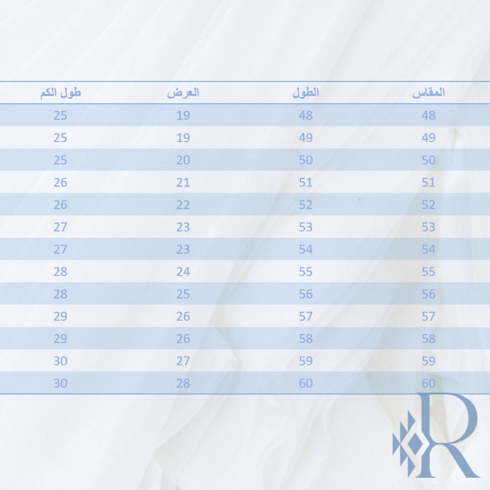 مقاسات العباية بالصورة: المقاس 52 العرض 22 انش